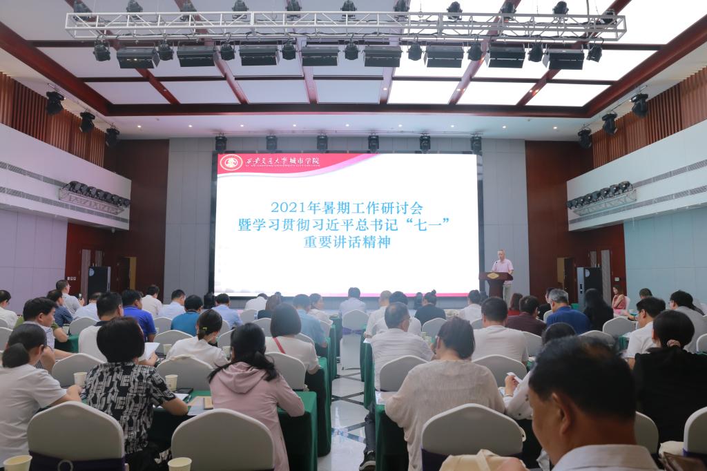 7月13日-16日,西安交通大学城市学院举行2021年暑期工作研讨暨学习贯彻习近平总书记“七一”重要讲话精神会议。本次会议的四个议题包括研讨西安交通大学城市学院“十四五”发展规划(征求意见稿)、师资队伍建设暨教师评价体系建设、以课程建设为抓手,全面推进一流专业建设、大学生素质拓展与提升体系建设与评价改革。陈光德院长、张爱萍书记、朱旭副院长分别作了主题发言。学院领导,教授会主席,各系(教学部)、中心(部)主任、副主任,各党支部书记,各学生工作负责人(主管)等80余人参加会议。