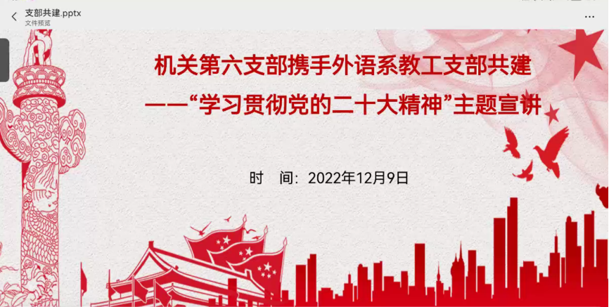 西安交通大学城市学院外语系教工党支部、外语系学生党支部、机关第六党支部共同开展学习贯彻党的二十大精神宣讲报告会