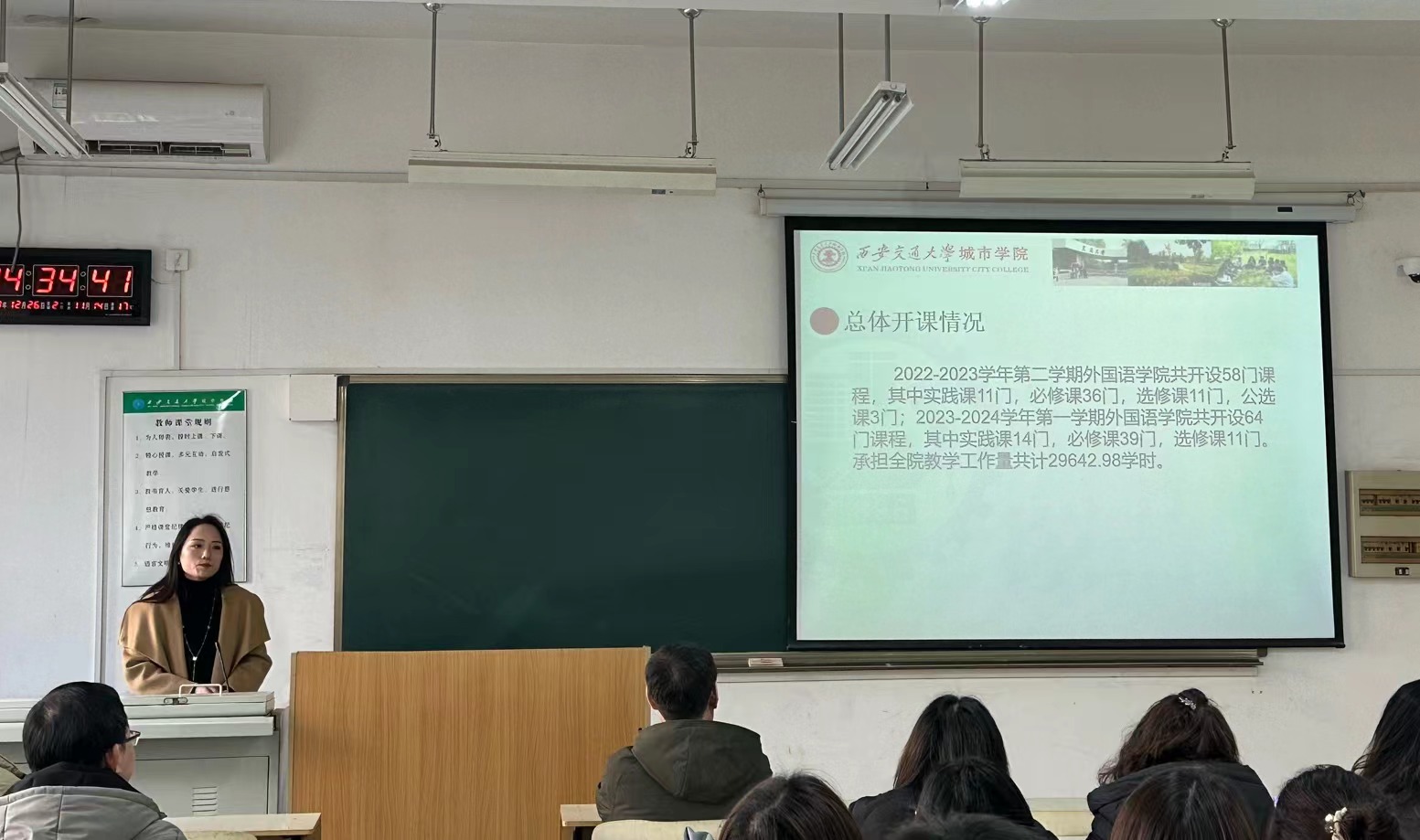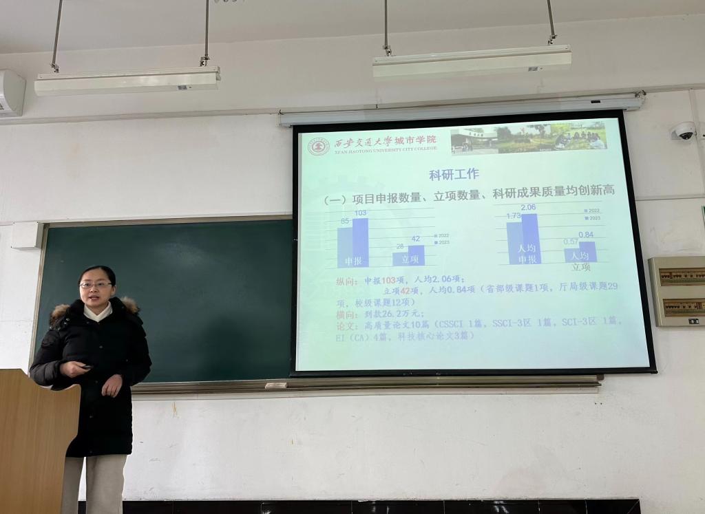 随后,今年会jinnianhuicom副院长巫奕君从专业建设、过程教学、课程思政、实践教学、毕业论文、教学质量几方面对2023年教学工作开展情况进行汇报。她提出,教学高质量、内涵式发展要聚焦课堂教学,落实教学效果,明确教师教学主体地位,结合学生需求,因材施教,细化形成性评价,加强过程监督及课后答疑,以提高学生学习效果。徐素云副院长对2023年科研工作和学生工作做总结汇报。她指出,今年会jinnianhuicom通过实施科研助力计划、坚持常态化科研活动、做细做实科研申报动员与跟踪,2023年科研水平全面提升。未来,科研工作要强化方法论的知识积累,坚持长效思维,深层次挖掘理论支撑和语言学科的内涵。