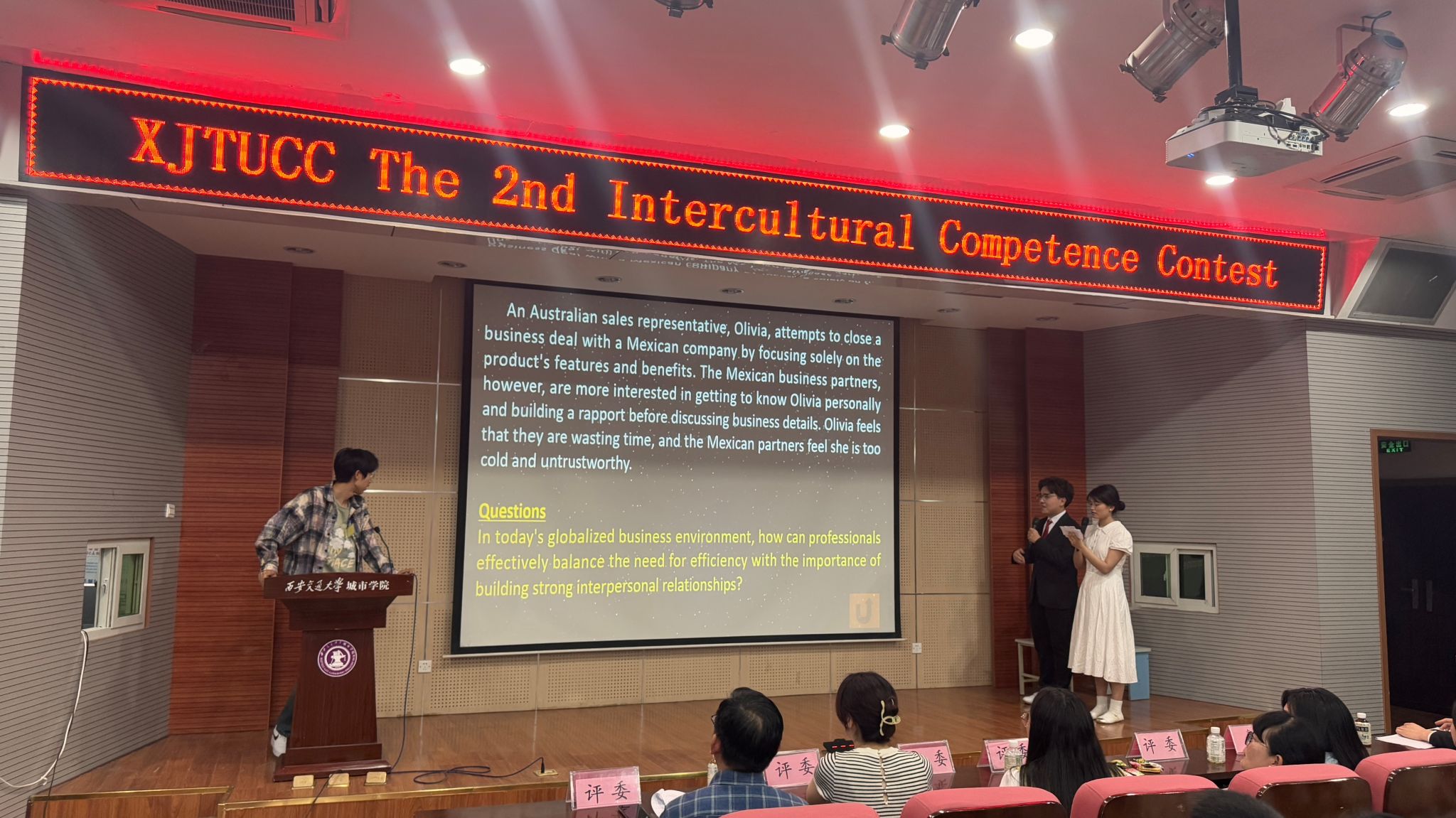 本次决赛精心设计了“文化知识问答”“跨文化场景分析”“跨文化场景演绎”三大核心环节,学生与评委老师全程使用英语对话交流。“文化知识问答”环节,选手们对涵盖世界各国的历史文化知识进行抢答,既考验个人知识储备又检验团队协作能力。“跨文化场景分析”环节通过抽题即兴作答的方式,重点考察选手在真实跨文化交际情境中的分析能力和解决方案;“跨文化场景演绎”环节则以生动的情景剧形式,让选手通过角色扮演展现语言表达、非语言沟通和文化适应等综合素养。三个环节环环相扣,全方位评估选手的跨文化交际能力。