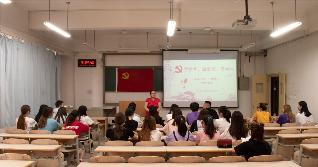为了庆祝中国共产党建党99周年,西安交通大学城市学院外语系、传播系学生党支部于7月1日下午16点在教学楼D107开展了主题为“学党章、温誓词、守初心”的“七·一”建党节特色活动。本次活动由党支部书记张天主持,组织委员杨耀聪、宣传委员刘牧原以及党支部全体党员共同参与。