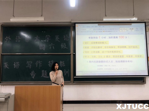 张慧有多年的四六级考试阅卷经验,她首先介绍了几种常见的写作题型,通过小测试的方式展示英语四六级作文的考点。接着,张慧对写作中的词汇运用、句型、语法等做了详细介绍。要求同学们正确看待作文模版,学会使用高级词汇,对已掌握的词汇句型,在熟练运用的基础上升级词藻,这样的作文才能在茫茫文海中脱颖而出,获得高分。同时,张慧强调,英语类专业的同学一定要尽早开始备考,在学习中善于总结,将专业所学和四六级考试联结起来,这样才能取得好成绩。