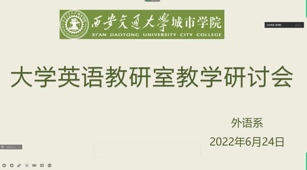 为进一步提升教师课堂教学质量与水平,提高大学英语四级通过率,2022年6月24日下午,西安交通大学城市学院外语系大学英语教研室在腾讯会议平台线上举办第四期大学英语四级系列教学讲座,特邀西安交通大学城市学院外语系大学英语课程首席教授李雪梅教授主讲,会议由巫奕君副教授主持。
