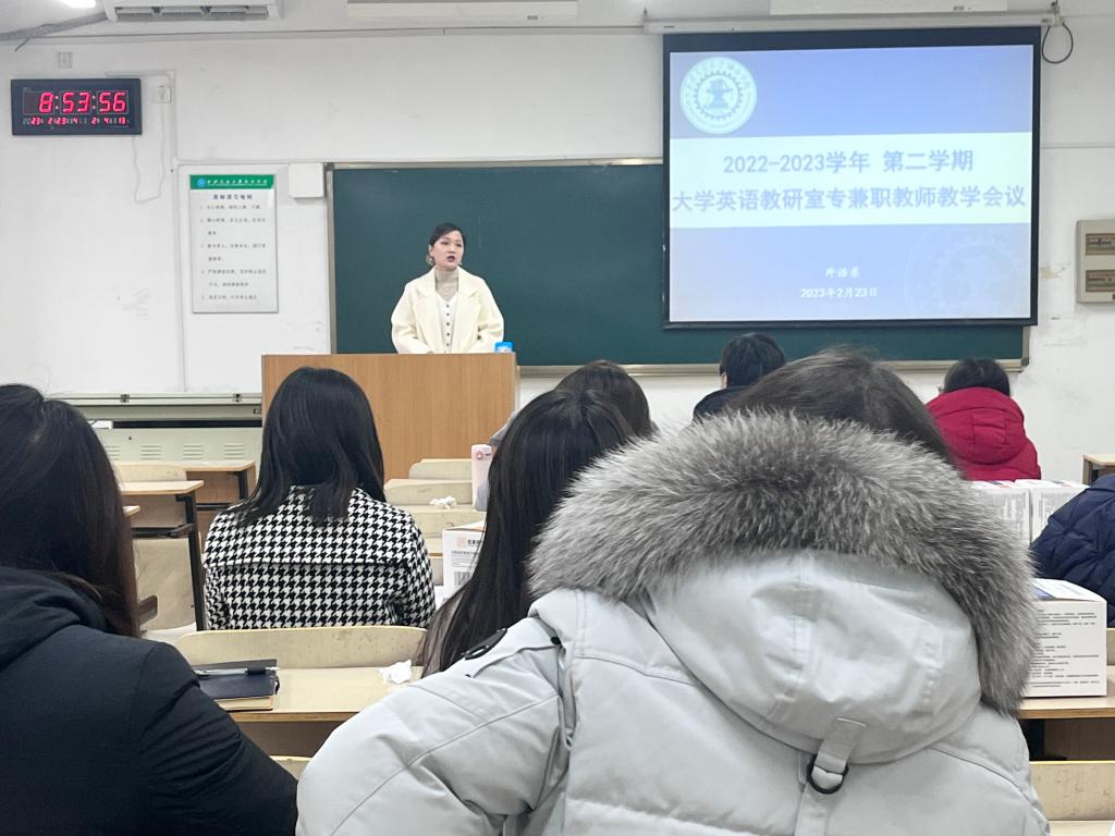 2023年2月23日上午,西安交通大学城市学院外语系在教学楼B319教室召开大学英语教研室专兼职教师教学会议,外语系副主任兼大英教研室主任巫奕君副教授主持会议,大英教研室全体专兼职老师共计40人参加了此次会议。
