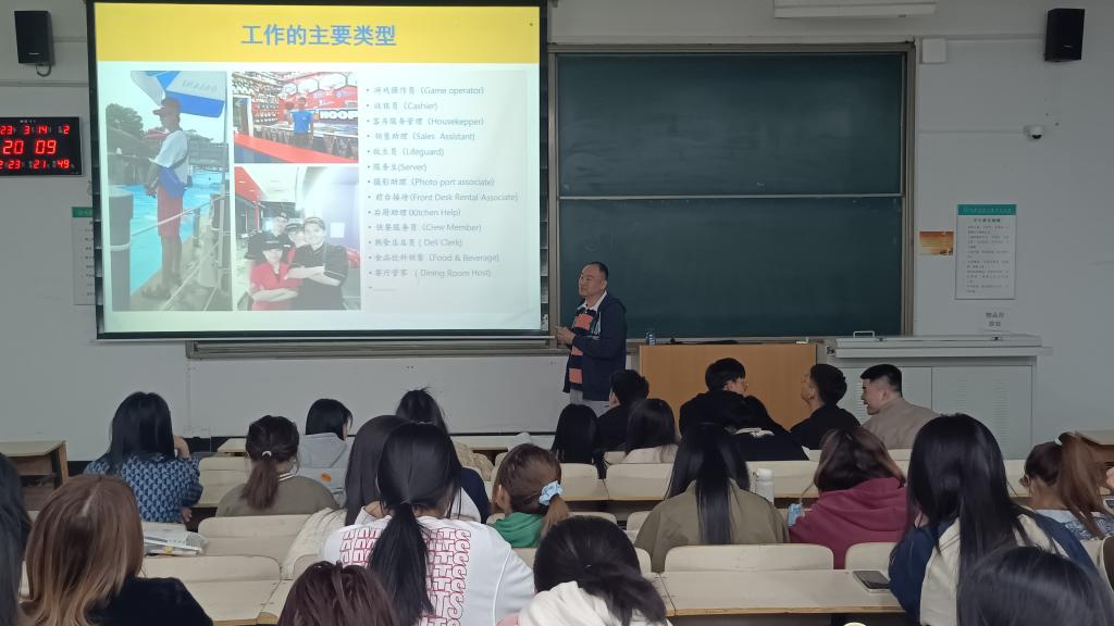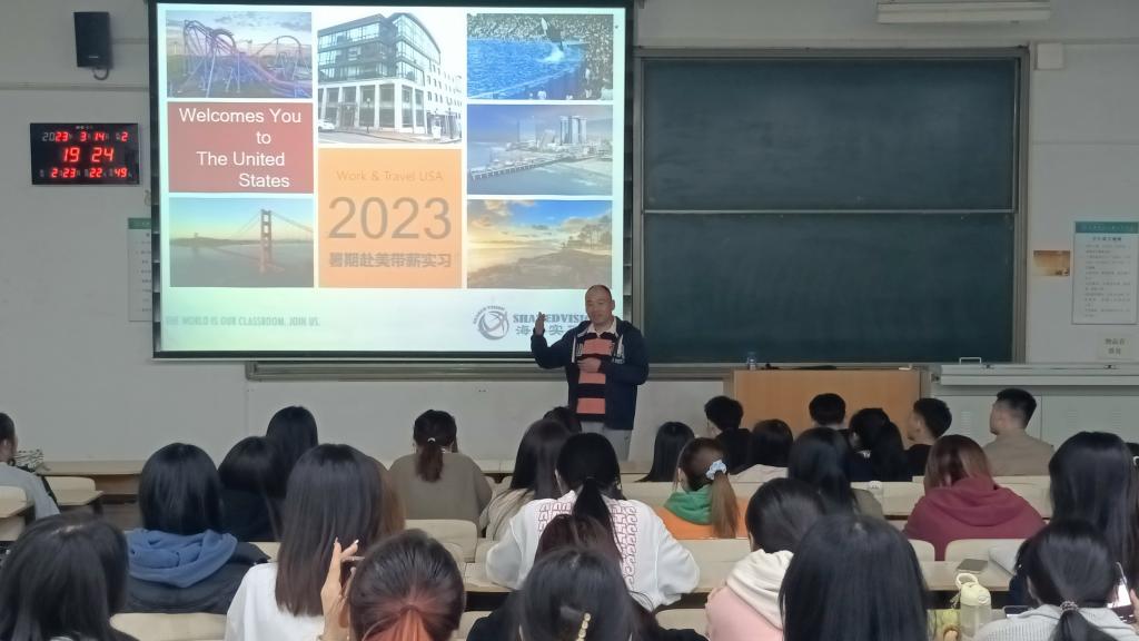 为增强外语系学生海外实习实践经历,开拓国际化视野,锻炼语言技能,西安交通大学城市学院外语系于3月15日在教学楼E200召开赴美带薪实习项目宣讲会。王予壮老师担任本次主讲人,有意愿出国实习的大一大二大三学生参与了本次讲座。