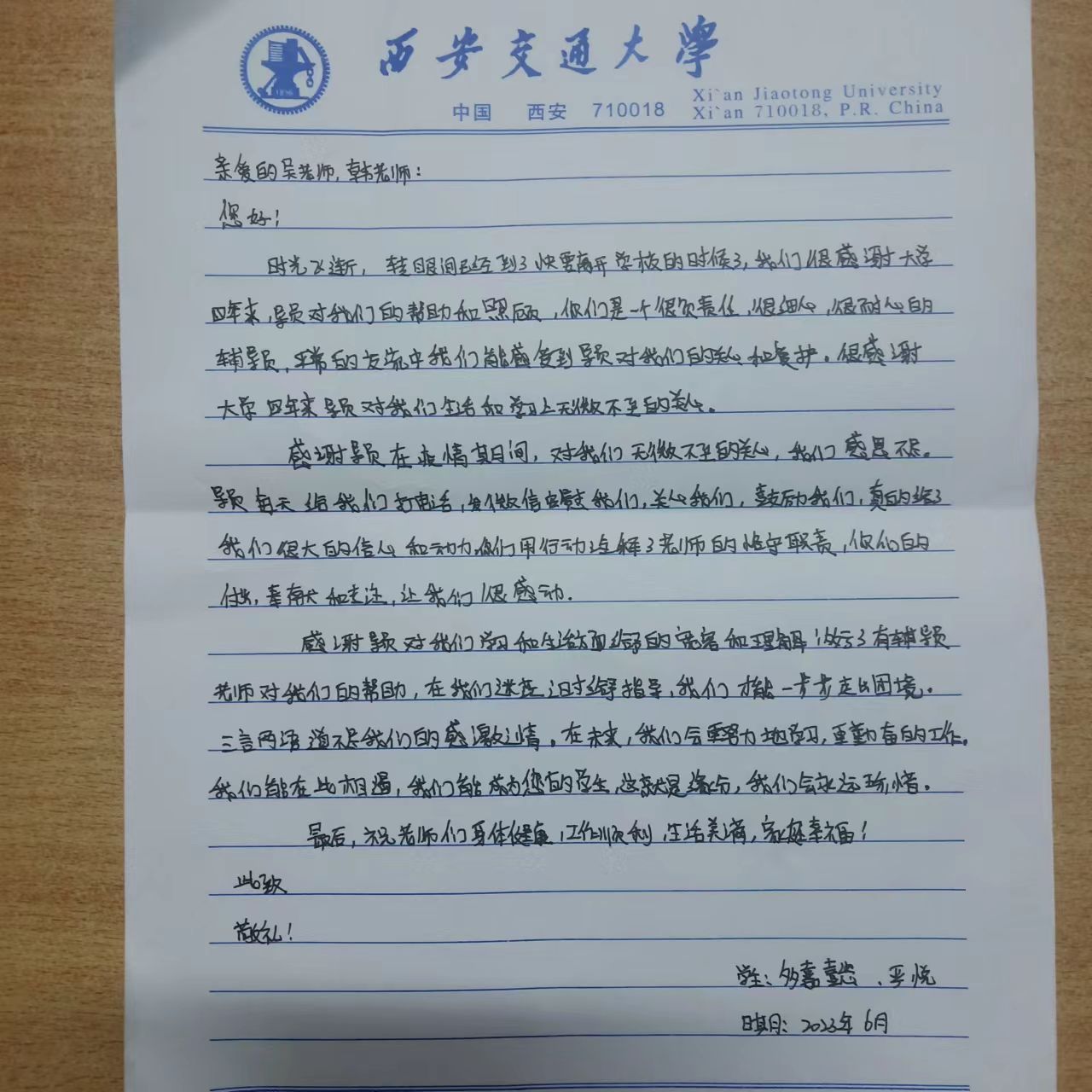 近日,西安交通大学城市学院外语系辅导员收到2023届毕业生多嘉懿、严悦两名同学发来的感谢信,表达了她们在大学四年期间,对辅导员老师的关心爱护的感谢之情。