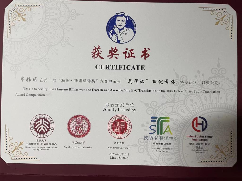 赛前,外语系高度重视,组建了由袁长普副教授负责、张慧副教授辅助的翻译比赛指导小组对参赛学生认真辅导,共提交13份有效稿件。最终,毕韩玥同学在获奖率仅为4%的大赛中脱颖而出,获得“英译汉”组优秀奖,袁长普老师获优秀指导老师奖。