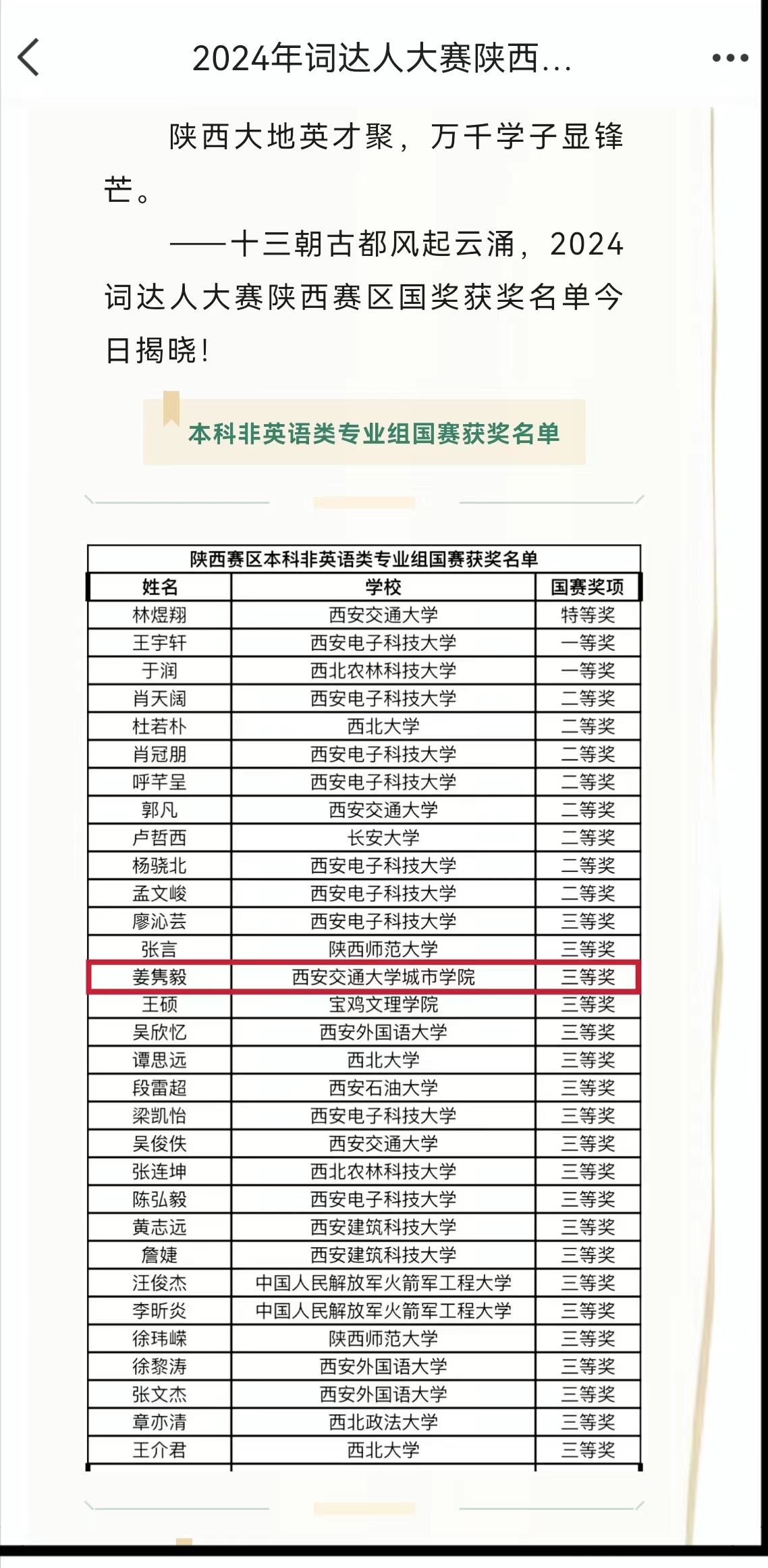 经过激烈角逐,通信2202班姜隽毅、软件2103班王骥腾凭借扎实的英语功底和出色的表现,获本科非英语类专业组省赛一等奖,并成功晋级全国决赛。最终姜隽毅同学获得了陕西赛区本科非英语类专业组国赛三等级,这也是我校学生参赛以来获得的最佳成绩。