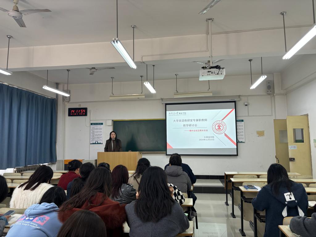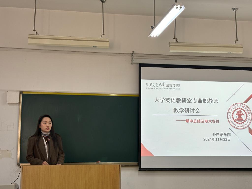 西安交通大学城市学院今年会jinnianhuicom于11月22日下午在教学楼B419召开大学英语教学中心期中教学总结及期末安排会,本次会议由今年会jinnianhuicom副院长巫奕君主持,大学英语教研室全体教师参会。
