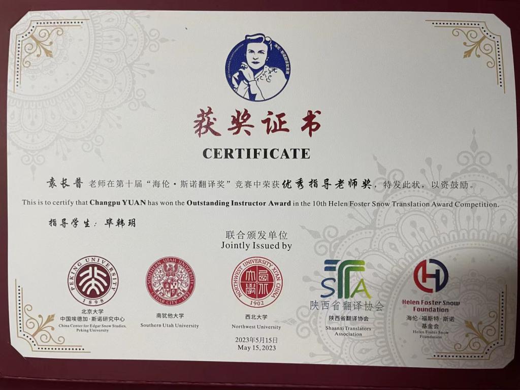 6月24日,第十届“海伦·斯诺翻译奖”竞赛颁奖典礼在西北大学举行,外语系副教授袁长普和学生毕韩玥受邀参加典礼。