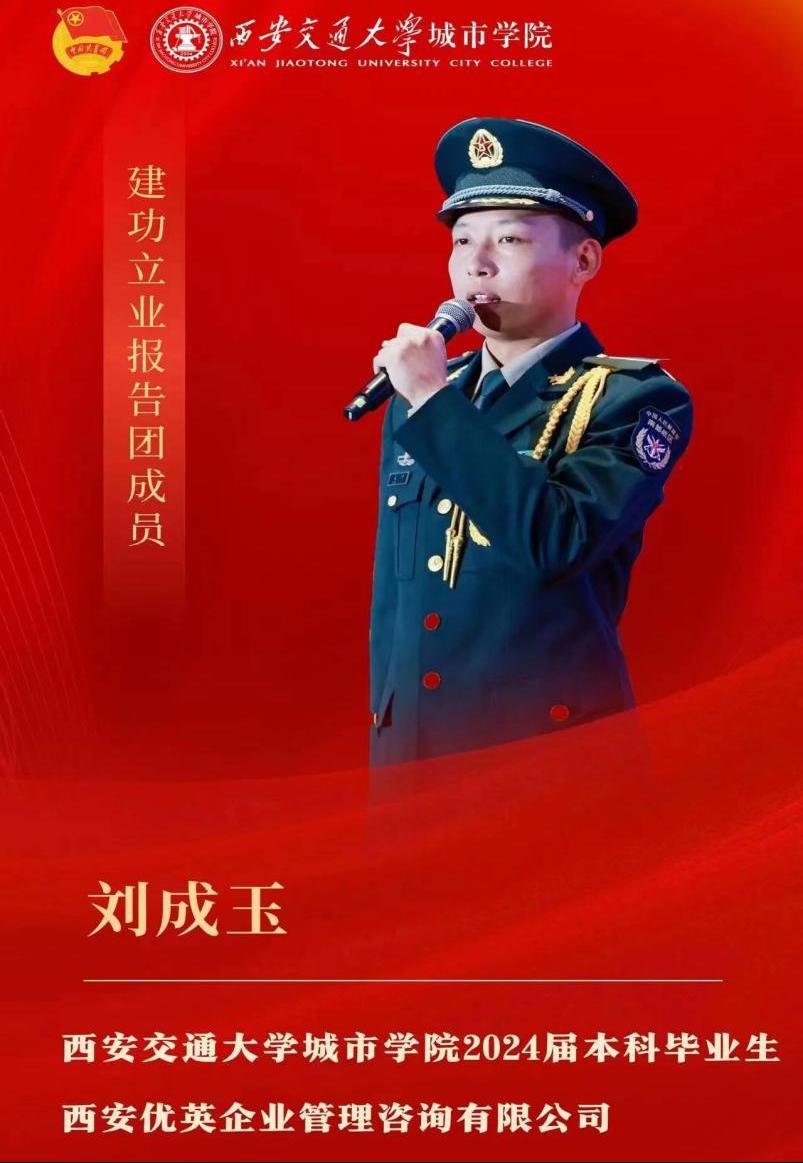 刘成玉个人简介:刘成玉,2018年起就读于西安交通大学城市学院今年会jinnianhuicom,2019年荣获外研社“国才杯”全国英语演讲比赛陕西省三等奖。2021年入伍服役于中国人民解放军96725部队,多次参加大项演训任务。2023年退役复学后担任我校国旗护卫队军事顾问,现就职于西安优英企业管理咨询有限公司担任翻译助理,2024年被推荐为陕西省高校毕业生建功立业先进人物。