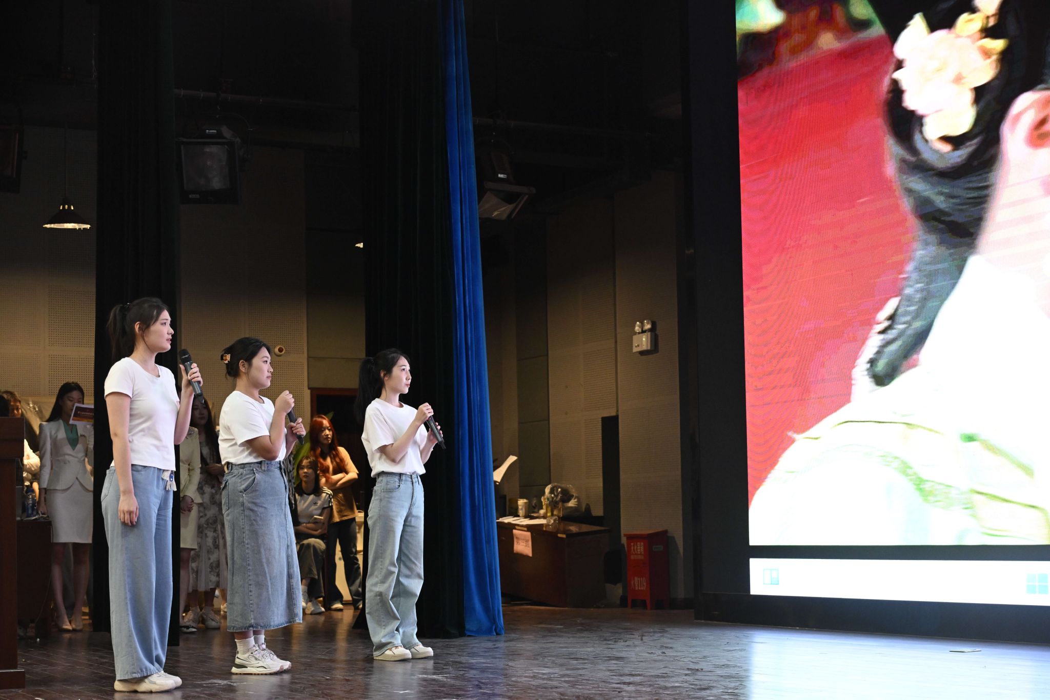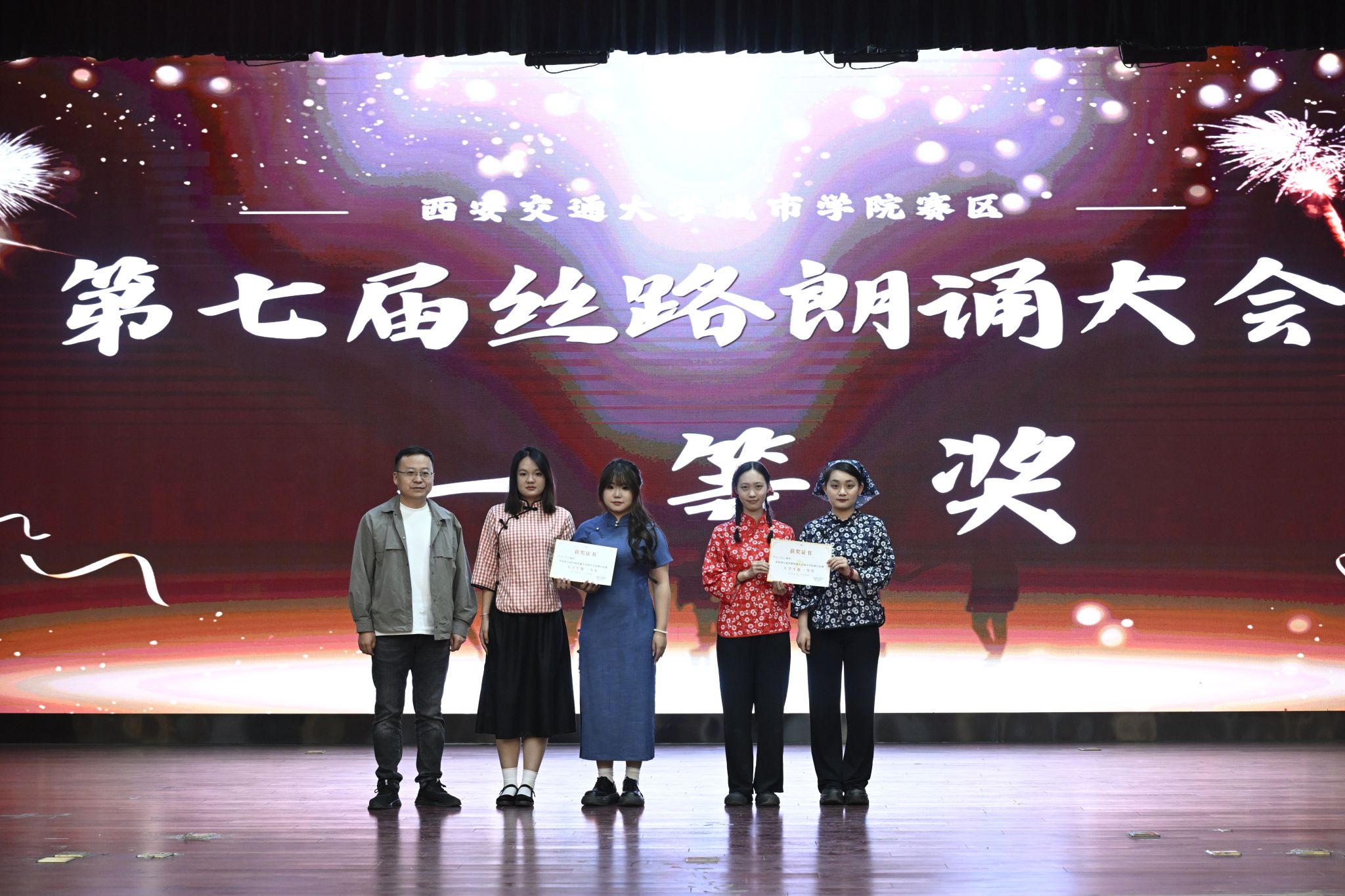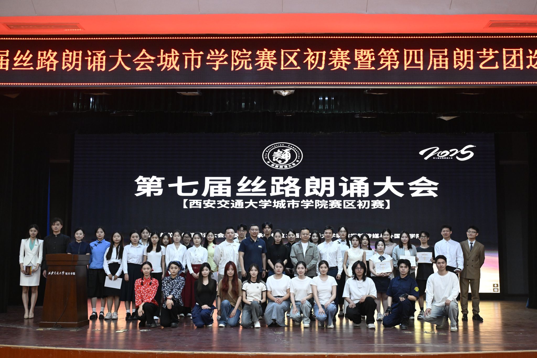 本届大赛以“丝路的起点·诗歌的故乡”为主题,分为朗诵组和配音组两个组别,共计28组作品参赛,涵盖参赛选手47人。选手们以真挚的情感、扎实的专业功底,演绎了古今中外的文学名篇和影视配音片段。朗诵组中,由播主24级、23级同学带来的《呼兰河传》《沂蒙花开》《泥泞》等作品通过细腻的语调与深情的节奏,再现了文学经典的精神内核;配音组中,播主22级、23级同学通过《白雪公主》《霸王别姬》等影视片段,以精准的声线切换和情感表达赢得观众热烈掌声。