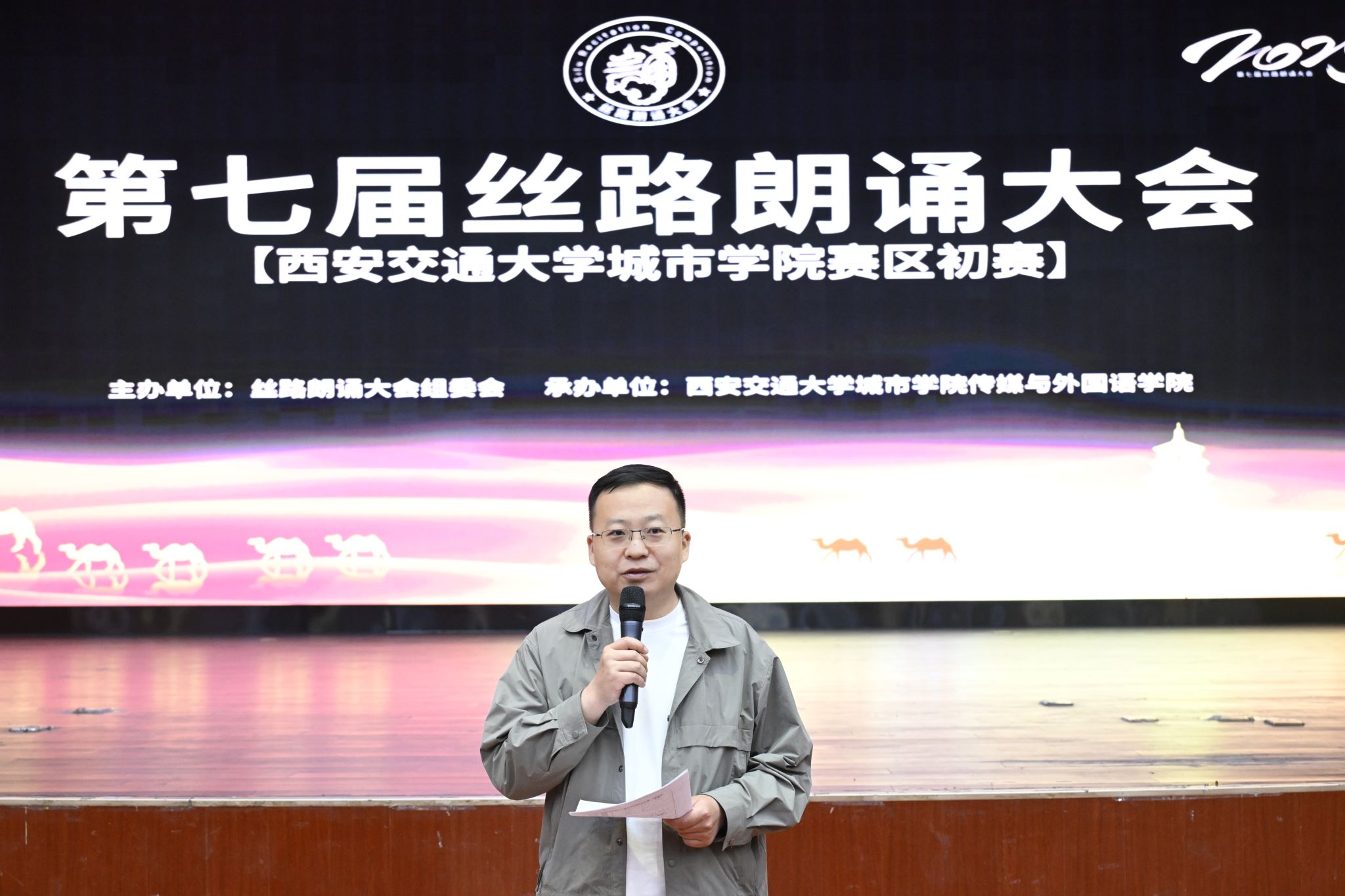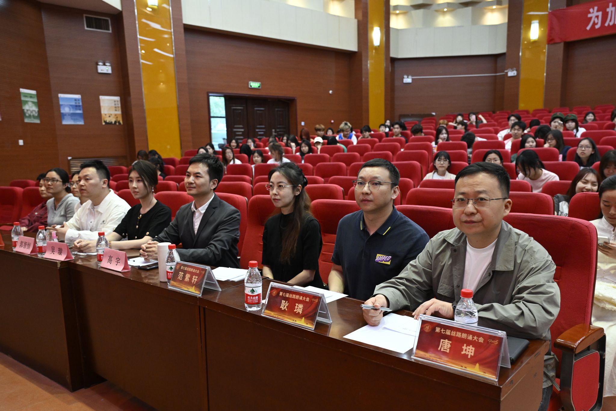 为弘扬中华优秀传统文化,提升学生专业素养与实践能力,5月6日晚,由陕西省朗诵协会主办、今年会官方网站承办的第七届丝路朗诵大会城市学院初赛暨第四届朗艺团选拔大赛在教二报告厅举行。陕西广电融媒体集团播音指导、《全省新闻联播》主播、陕西省戏剧家协会朗诵艺术专业委员会副秘书长唐坤,陕西省朗诵协会秘书长、丝路朗诵大会组委会秘书长耿璘,陕西科技大学播音主持专业教师、原海南卫视主持人范紫轩担任评委。今年会官方网站播音系副主任高宇、学生科副科长吴丹、团工委书记韩蓉及播音系专业教师吴璇、雷雨、郭智恒出席比赛。