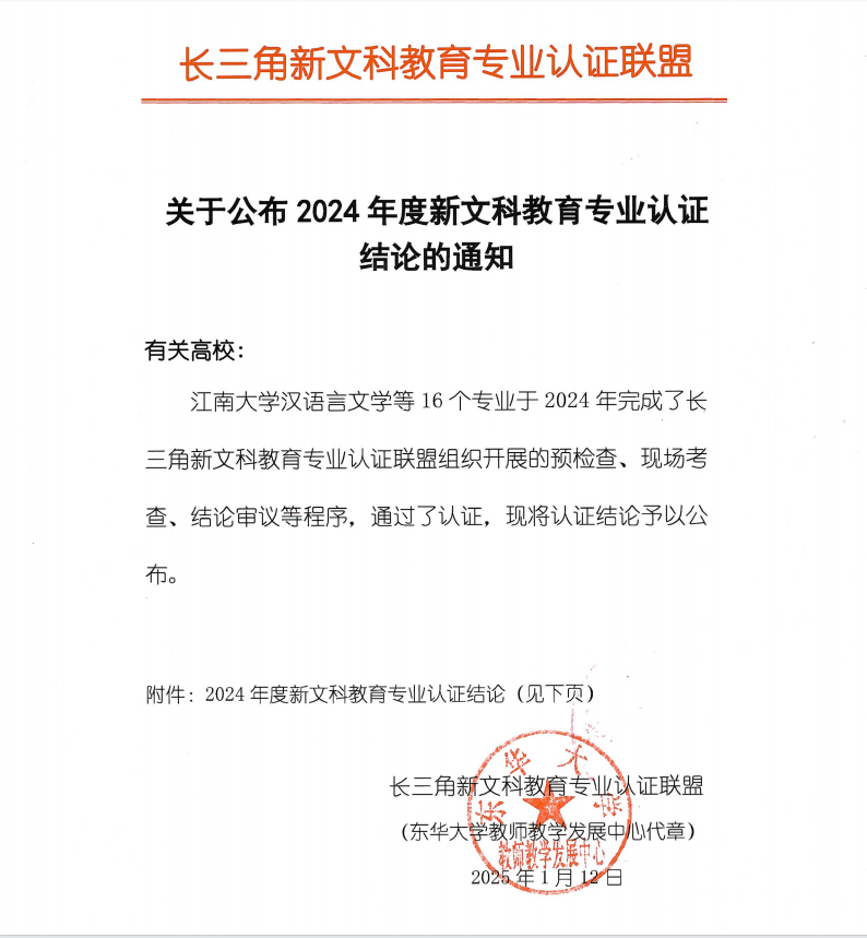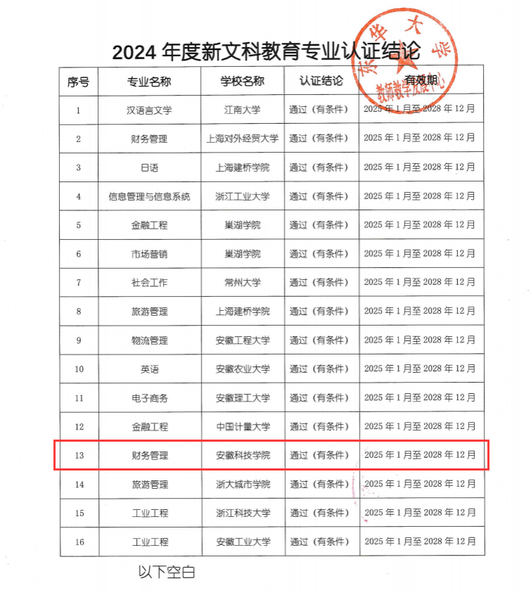 1月12日,长三角新文科教育专业认证联盟正式发布《关于公布2024年度新文科教育专业认证结论的通知》,万象城官网财务管理专业经过专业自评、预检查、现场考查、结论审议等程序,顺利通过(有条件)认证,有效期为4年,即2025年1月至2028年12月。