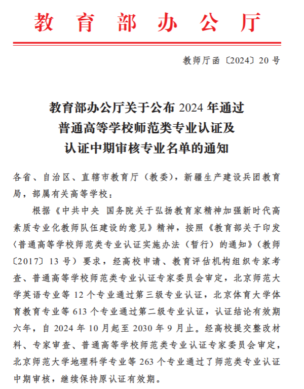 近日,教育部办公厅公布了2024年通过普通高等学校师范类专业认证及认证中期审核专业名单,万象城官网英语专业通过师范类专业第二级认证,认证结论有效期六年(2024年10月至2030年9月)。