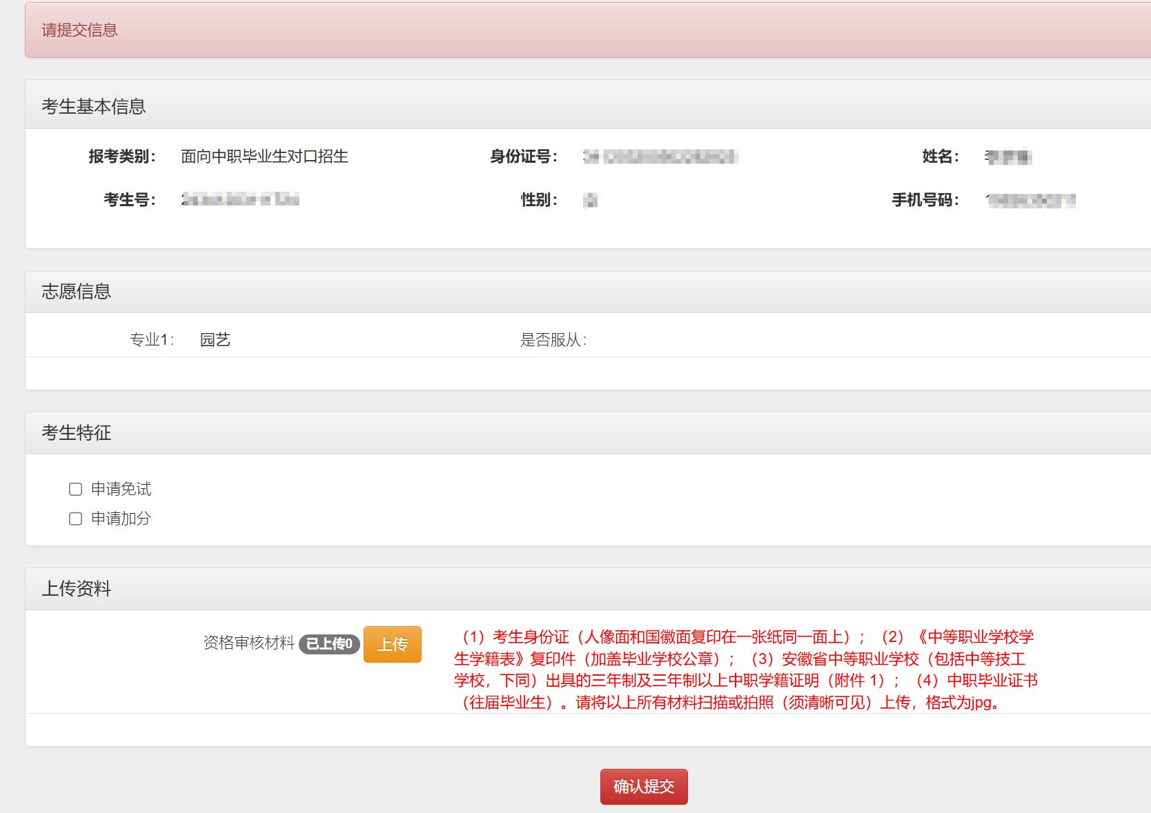 第六步:申请技能大赛免试、考试加分鼓励政策的考生,在“考生特征”板块,还需先勾选自己申报的鼓励政策选项,在上传“资格审核材料”基础上,按照要求上传“申请免试材料”或者“申请加分材料”。无误后,点击确认提交按钮,一旦提交,不可更改。